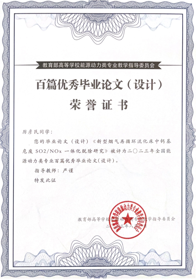 严谨老师指导的集控191厉彦民同学本科毕业论文《新型烟气再循环流化床中钙基危废SO2/NOx一体化脱除研究》入选,这是杏吧视频