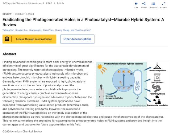 为第一署名单位,在国际权威期刊《ACS Applied Materials & Interfaces》上发表题为“Eradicating the Photogenerated Holes in a Photocatalyst–Microbe Hybrid System: A Review”的学术论文。《ACS Applied Materials & Interfaces》是美国化学会旗下材料、能源类顶级期刊,中科院二区TOP期刊,影响因子为8.3。