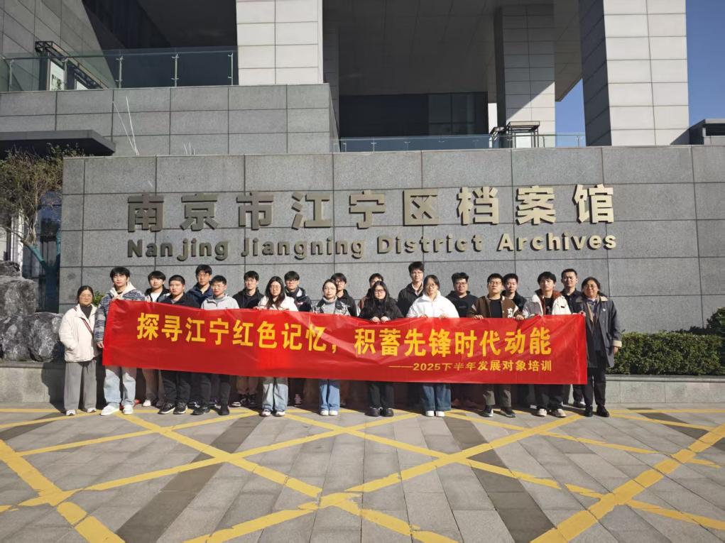 为深入贯彻落实党史学习教育常态化要求,强化学生发展对象的党性修养与使命担当,2025年11月26日,能源与动力工程学院分党校在党委书记徐艳的带领下,组织本期学生发展对象培训班学员,赴南京市江宁区档案馆开展“探寻江宁红色记忆,积蓄先锋时代动能”主题实践课,引导学员在红色档案中感悟初心使命,汲取奋进力量。