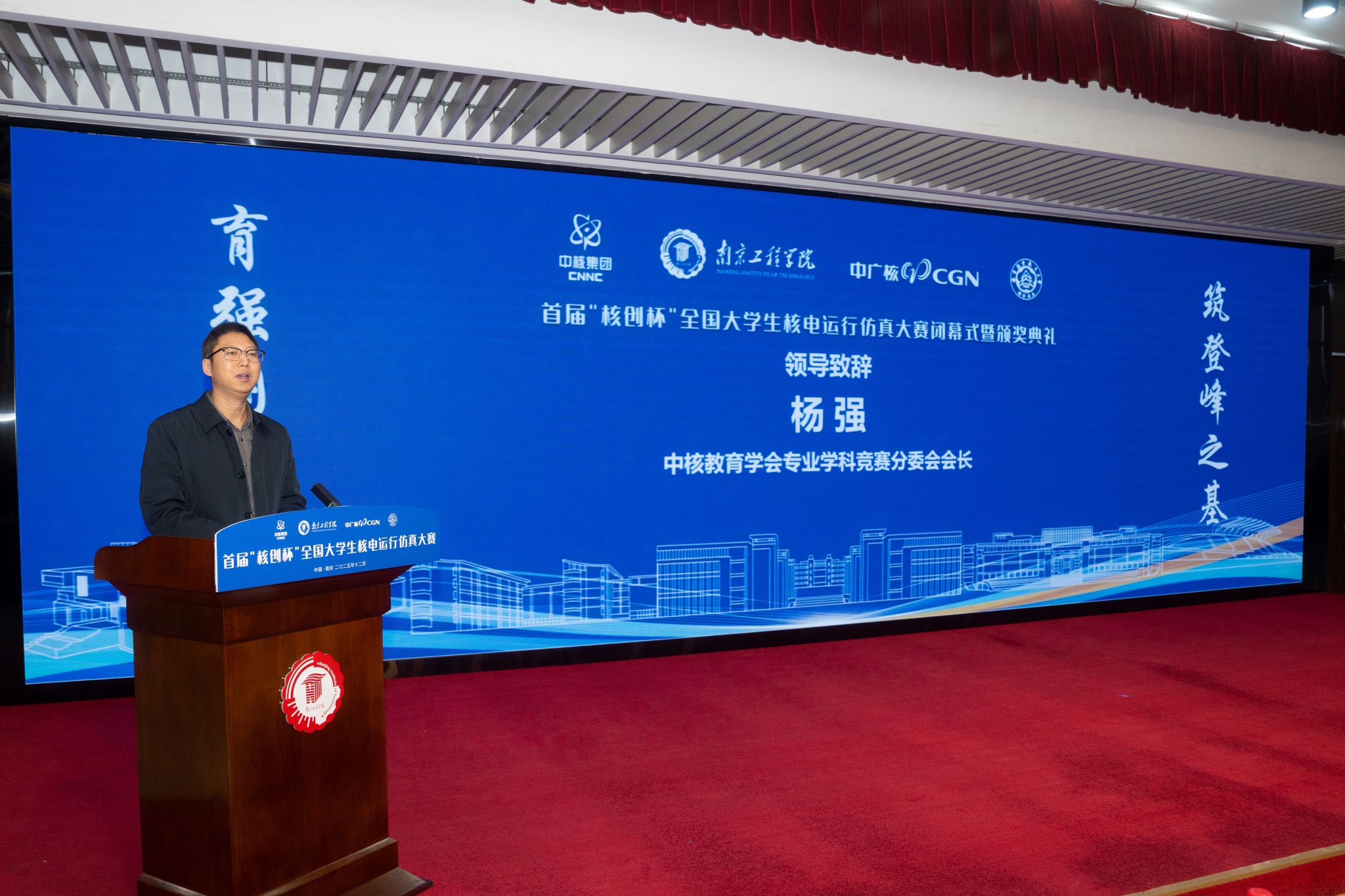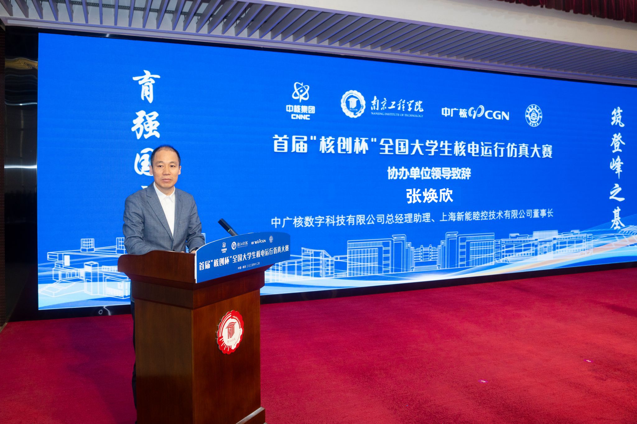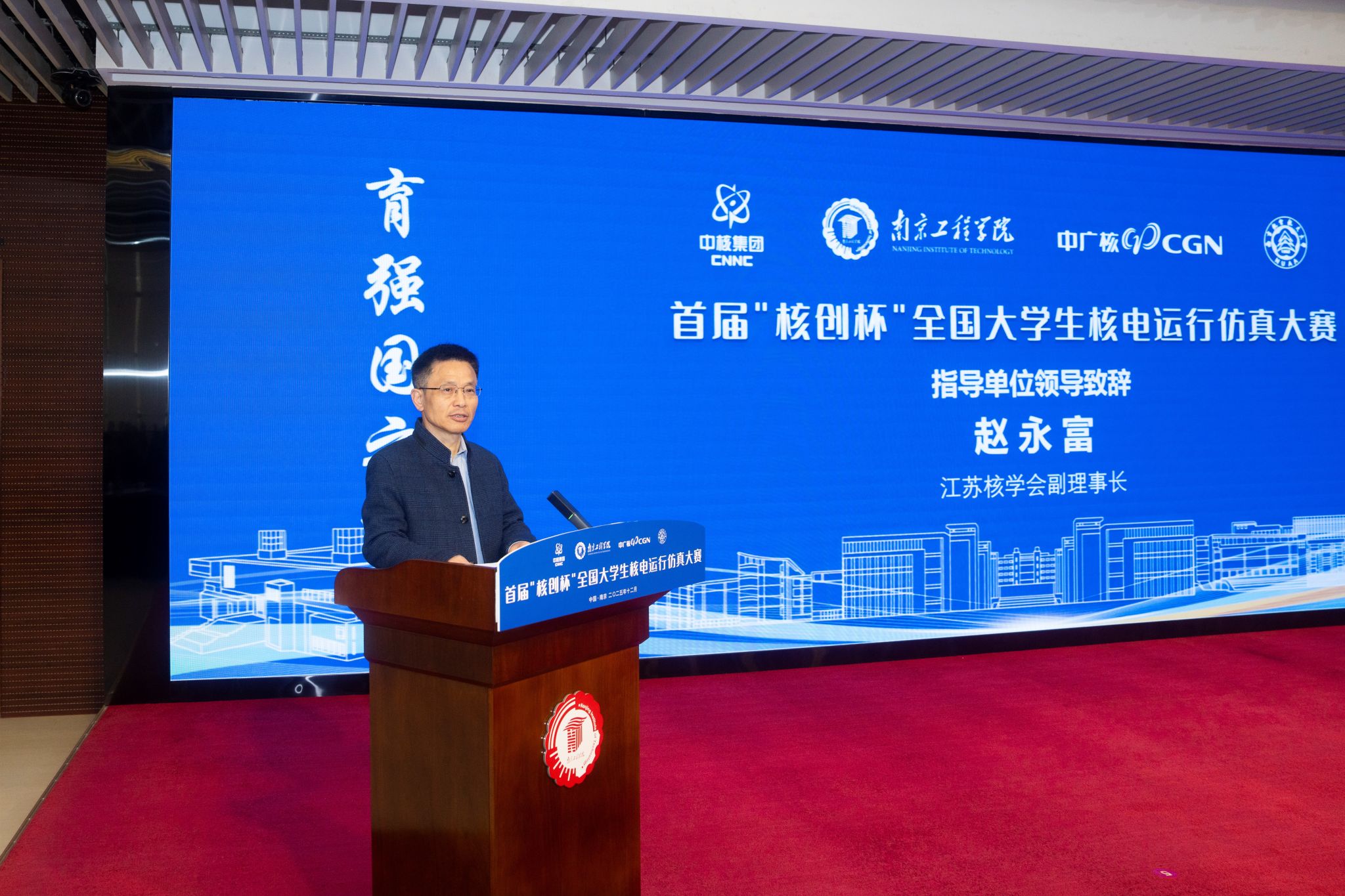 江苏省核学会副理事长赵永富在致辞中指出,大赛是对新时代高等教育“立德树人”根本任务的积极响应,构建了“学赛研用”一体化平台。他代表学会对赛事筹备单位表示感谢,并强调学会将持续关注并支持核工程教育创新,推动产学研深度融合,为核电事业储备高素质技术人才。中广核数字科技有限公司董事长张焕欣在发言中肯定大赛对校企协同育人的推动作用,期待共同培育核电事业后备力量。