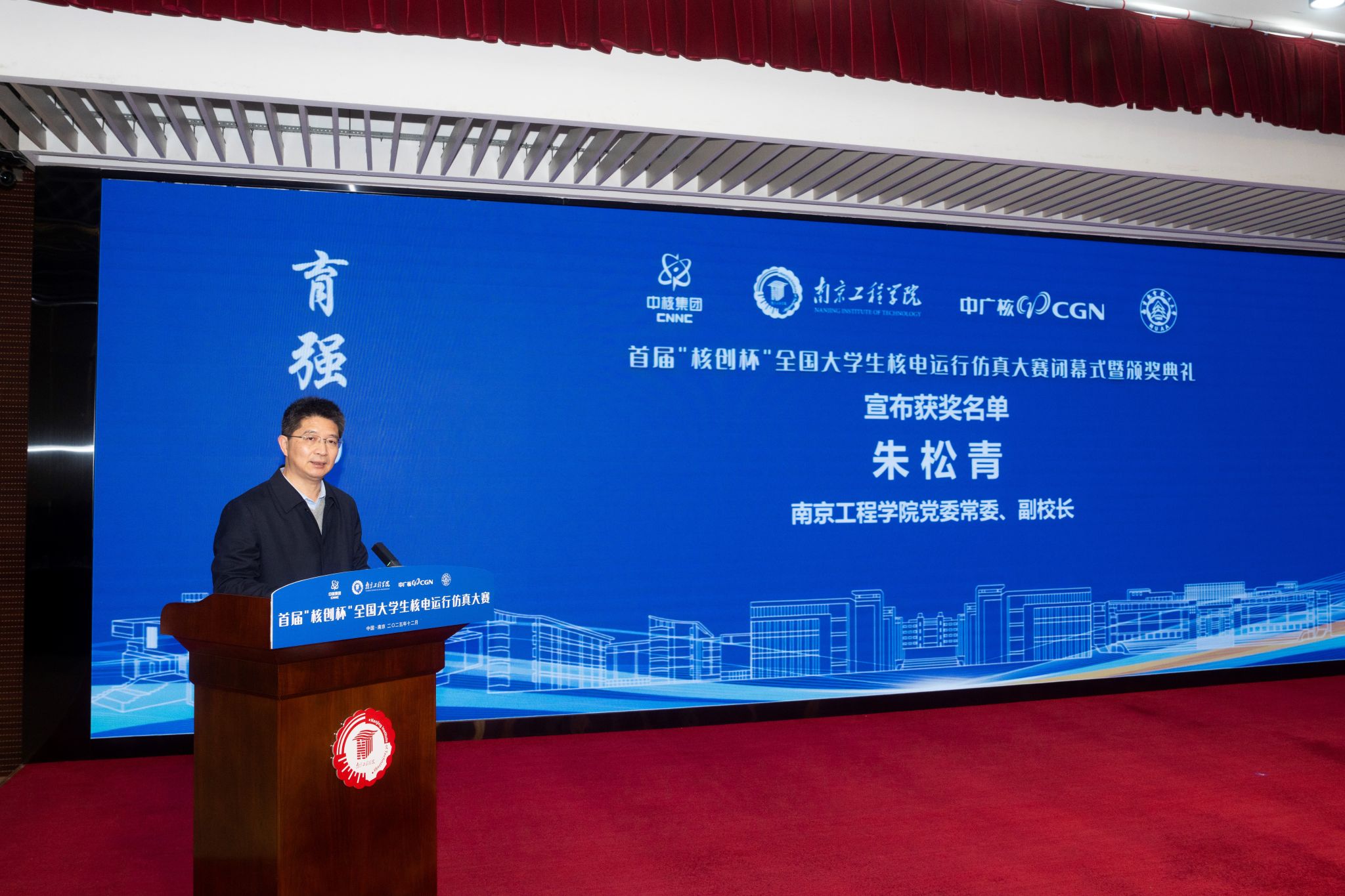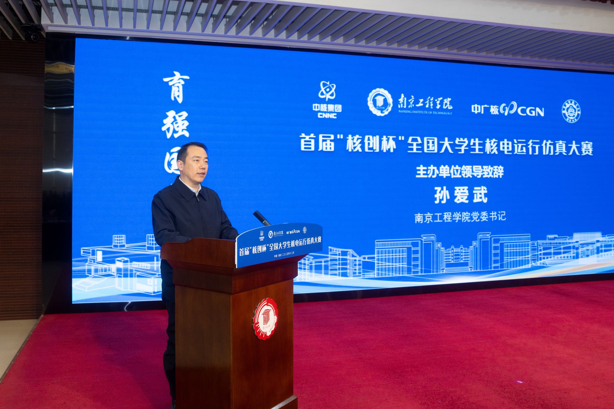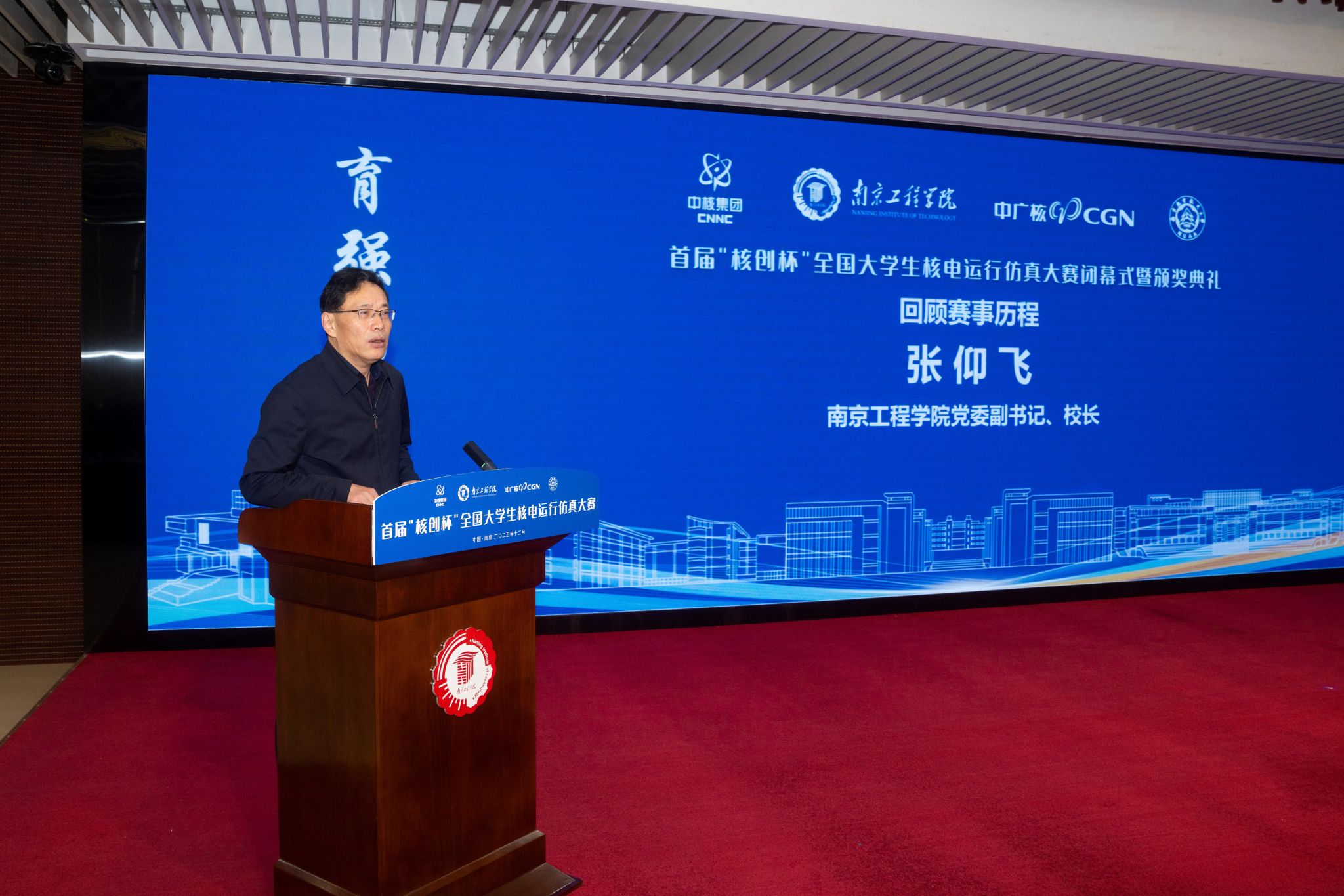 江苏省核学会副理事长赵永富在致辞中指出,大赛是对新时代高等教育“立德树人”根本任务的积极响应,构建了“学赛研用”一体化平台。他代表学会对赛事筹备单位表示感谢,并强调学会将持续关注并支持核工程教育创新,推动产学研深度融合,为核电事业储备高素质技术人才。中广核数字科技有限公司董事长张焕欣在发言中肯定大赛对校企协同育人的推动作用,期待共同培育核电事业后备力量。