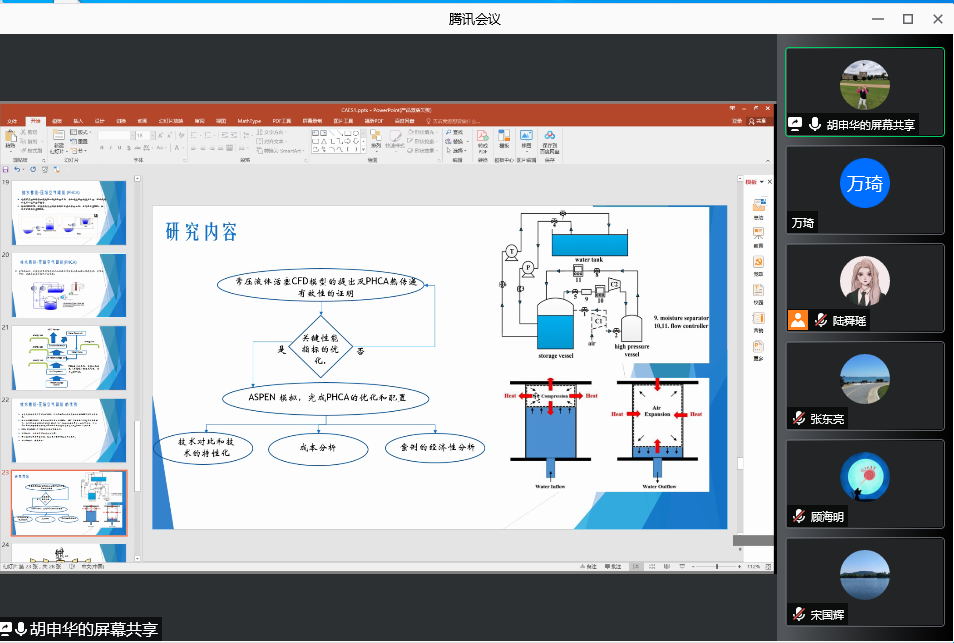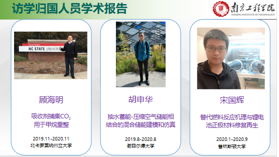 顾海明、胡申华和宋国辉三位老师在2019-2020期间分别前往北卡罗莱纳州立大学、谢菲尔德大学和普林斯顿大学进行了为期半年至一年的学术访问。三位老师围绕各自在境外研修期间的业务学习、科学研究、文化生活和心得体会等方面做了精彩分享。在学术成果方面,顾海明老师就吸收剂捕集CO2用于甲烷重整作了分享,胡申华老师分享了抽水蓄能-压缩空气储能相结合的混合储能建模和仿真技术,宋国辉老师分享了替代燃料反应机理与锂电池正极材料修复再生技术,三位老师为大家奉献了一场精彩纷呈的学术盛宴。