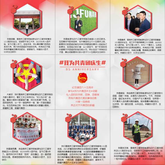 “我为共青团庆生”活动由能动学院分团委发起,以“一段话祝福,一幅图传递”的形式,在微博、QQ等新媒体亮出自己的态度,传递“90后”青年团员们的光荣与梦想。活动发起仅一天时间内,话题讨论超过三千多次,获点赞千次。二百余名同学运用不同形式的表现手法,诉说着自己的爱团之情。众多参与者中,有利用五一假期回到中学母校,重温入团记忆的大一新生,有脸贴团徽、手持团旗的学生干部,还有来自中核集团、东南大学、浙江大学的青年校友们。创业达人唐虎、全国大学生自强之星提名奖获得者王祥龙也加入到传递行列,用青春洋溢的笑容为共青团“庆生”。