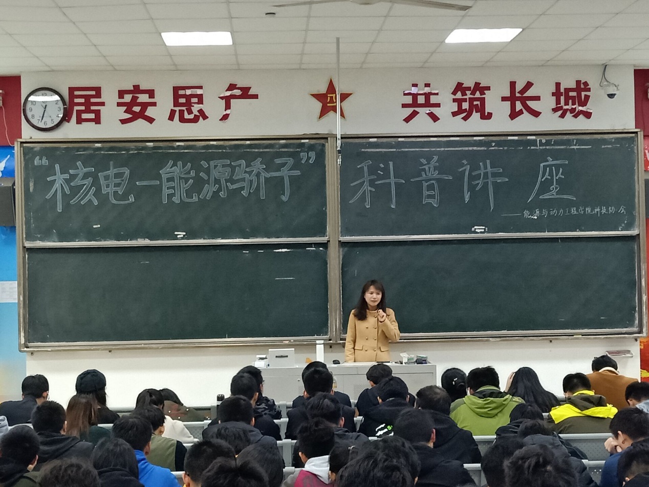 讲座中,彭老师从史上三次核泄漏事件入题,通过翔实的数据、丰富的图文素材,深入浅出地讲解了什么是核能、核能从哪里来、核能是否安全等基础知识,还原核能发展的历史真相,揭开核电的神秘面纱。互动环节中,彭老师细心解答了同学们提出的关于核电发展、核泄漏的危害和处理等方面的问题。她还结合自身求学经历向同学们介绍了核电专业的就业前景,鼓励大家重视专业理论基础的学习,通过不断的实践与创新去修炼自己,提高自己。