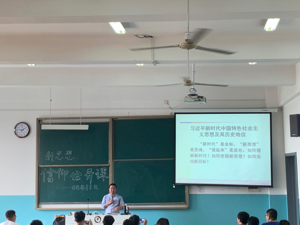 为了提升了2019级新生的政治理论水平和思想道德修养,9月12日下午,国际教育学院邀请人文与社会科学学院王孝勇教授,在经管楼D401教室为国教院19级新生展开了一场以“特色新思想、素养新提升”为主题的“新思想公开课”。