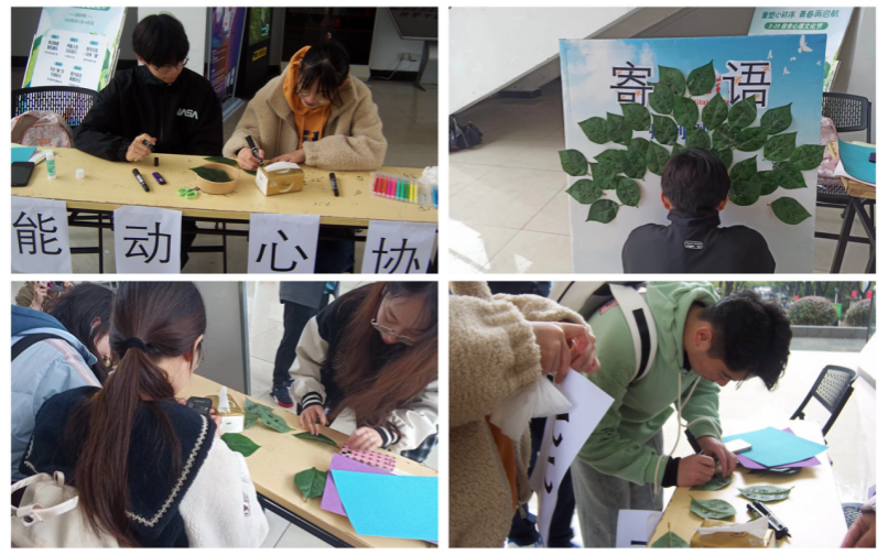 为有效促进同学之间的交流,营造友善、温暖、和谐的心育氛围,体现更多姿多彩的心理文化。3月底,学院举办“春风有信”书信寄语活动。本次活动采用最传统的书信来表达同学间最淳朴的情感。参加活动的学生在校园各处寻找能代表春天的叶子,邀请全院师生在树叶上留下了对未来美好生活的期盼或对亲人朋友的祝福,并将其制作成展板进行展示宣传。“春暖花开,好消息都在赶来的路上了,希望自己能够顺利上岸”,正在耐心等待考研复试结果的同学如此写道。