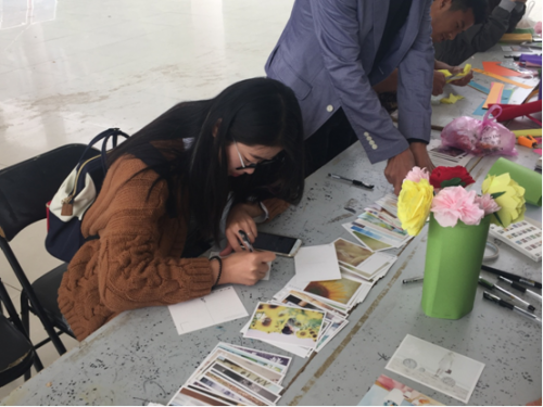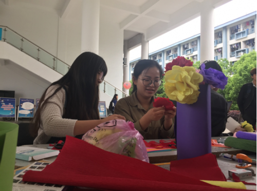 此次感恩母亲节主题活动分为“家书抵万金”、“我与母亲的合影”、“手折康乃馨”等环节。活动中,同学们可以现场领取一张精美明信片,将想对母亲说的话写在明信片上,交由工作人员一并寄给远在家乡的母亲。一句句生动感人的话语,满载着每个人对母亲的拳拳真情和深深祝福。“我和母亲的合影”活动中一张张妈妈们的不老容颜,一个个与妈妈的亲密瞬间,让来往的同学叹羡不已。最受同学们欢迎的当属“手折康乃馨”环节,各位参与者利用彩纸、剪刀和胶棒等材料,在专职人员的指导下亲手为母亲折出多支康乃馨。“虽然过程有些繁琐,但是能亲手为妈妈做一朵爱的康乃馨比在外面花钱买东西要好多了,既贴心又环保。”刚做成一朵红色康乃馨的参与者这样说道。